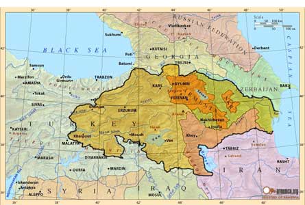 | A Armênia Maior no século XIII. Em laranja o atual território armênico. |