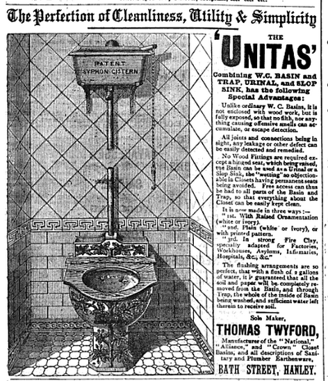 | Propaganda em um jornal inglês, anunciando o "unitas", o vaso sanitário produzido por Thomas Twyford, descrito como confortável, eficiente e bastante higiênico. |