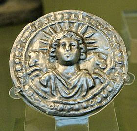 Alto-relevo mostrando a investidura do imperador Sapor II (centro). Na esquerda, o deus Mitra e na direita Áura-Masda. Nota-se que enquanto Mitra ainda ilumina o imperador, Aúra-Masda divide com o monarca um símbolo real, representando o direito divino de governar sendo concedido a Sapor II pelos próprios deuses.