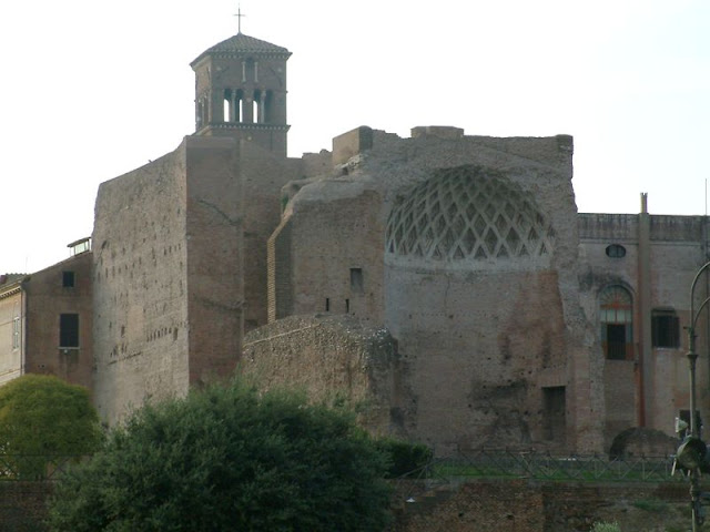 | Ruínas do Templo de Vênus e Roma, construído entre 121 e 141 pelo imperador Adriano. Hoje consiste na Igreja de Santa Francisca Romana. |