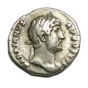 | Moeda com a efígie do imperador Adriano. A moeda traz os seguintes dizeres em latim "Hadrianus Augustus". |