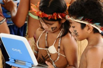 | Crianças indígenas interagindo com um computador, parte do incentivo a integração das crianças, jovens e adultos a informática. |