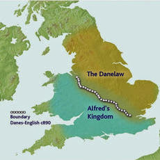 | O Danelaw no ano de 890 e sua fronteira com o reino de Alfredo, agora, senhor de Wessex e Mércia. |