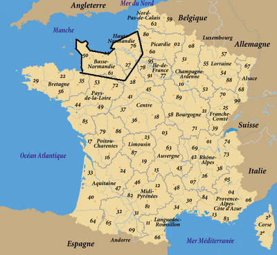 | Mapa com a atual divisão administrativa da França. Em destaque a Normandia. |