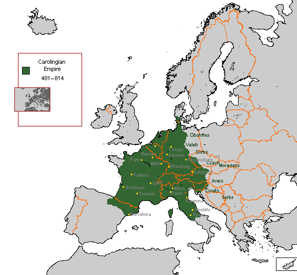 | O Império Carolíngio em sua máxima extensão até o ano de 814. |