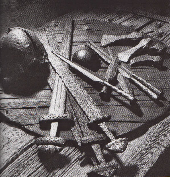 | Alguns achados arqueológicos. Um elmo, quatro espadas, quatro pontas de lança, quatro lâminas de machado e um escudo. |