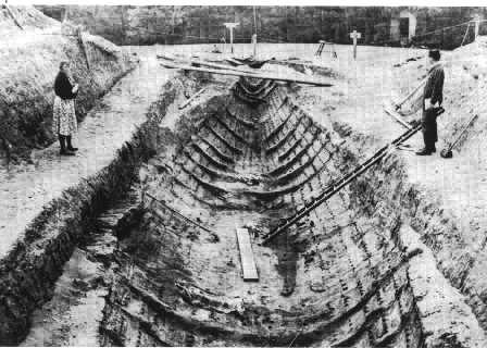 | Foto da década de 30 mostrando o sítio arqueológico de um barco túmulo. |