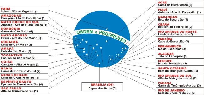 | Localização dos estados e do distrito federal nas estrelas da bandeira do Brasil. |