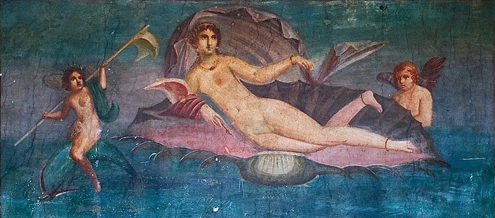 | Afresco romano de Pompeia, retratando a deusa Vênus saindo do mar. Vênus era a deusa romana do amor, da beleza, da sensualidade e da sexualidade. Segundo o mito, ela nasceu no mar. |