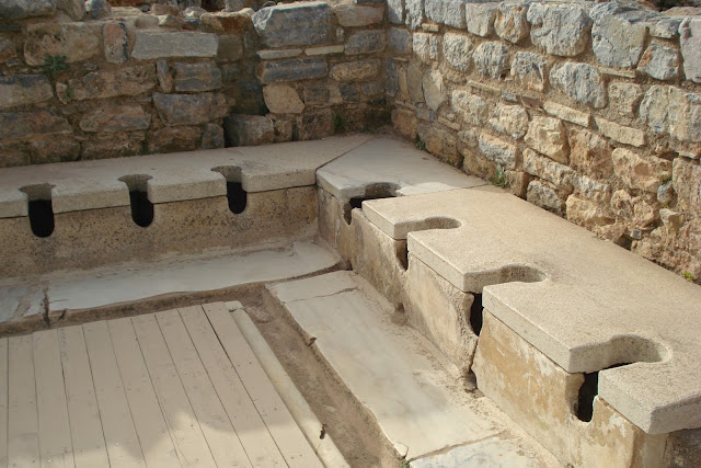 Os banheiros já eram separados naquela época, havendo banheiros para os homens e banheiros para as mulheres. Contudo, não existia privacidade como se pode ver bem na imagem acima. Os homens e as mulheres faziam suas necessidades na frente de outras pessoas e até aproveitavam para ficar conversando. Nestes banheiros havia escravos ou escravas para cuidar da limpeza (embora fossem locais fedorentos e sujos), como também o escravo fornecia aos usuários uma esponja (era uma esponja marinha) em um cabo, a qual era usada para se limpar após ter defecado. O problema é que essa esponja não era descartável; após o seu uso, o escravo a limpava em uma bacia ou pia, e entregava para o próximo usuário. Quando a esponja estivesse desgastada ela era descartada.