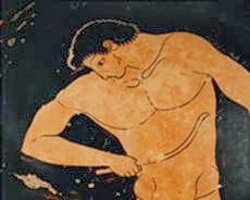 | Pintura grega retratando um homem usando o estrígil para se lavar. |