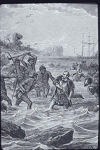 orilla, los barcos dispararon seis cañonazos en señal de paz. Al saltar á