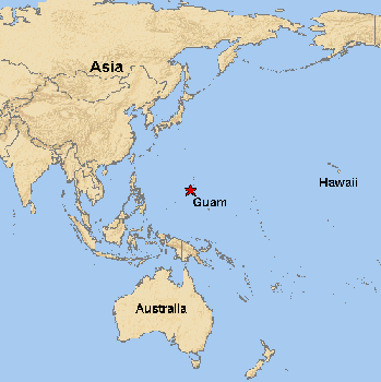 | Localização da ilha Guam, outrora chamada de Ilha dos Ladrões pela tripulação de Magalhães em 1521. |