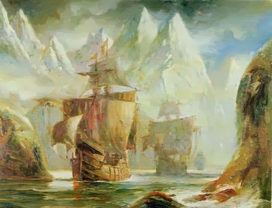 | Os navios da expedição de Magalhães cruzando o Estreito de Magalhães. |