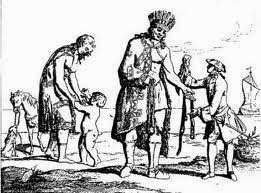 | Desenho retratando um europeu diante dos gigantes patagões. |