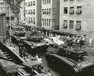 | Tanques de guerra e tropas do exército patrulham ruas do Rio de Janeiro, no dia 1 de abril de 1964, quando o golpe se instaurava. |