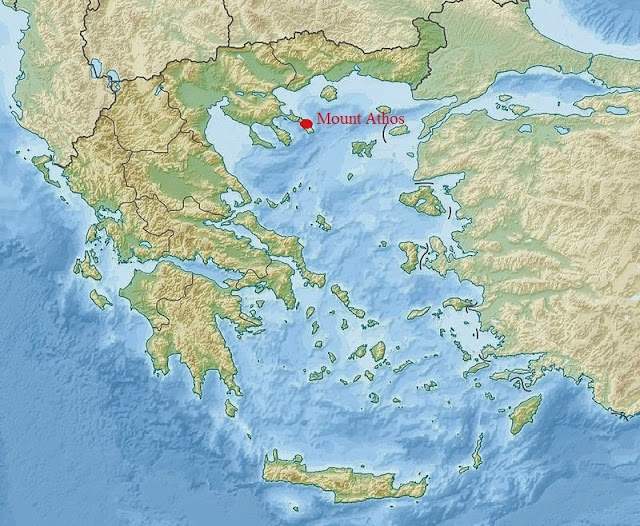 | Localização do Monte Atos na Grécia. |