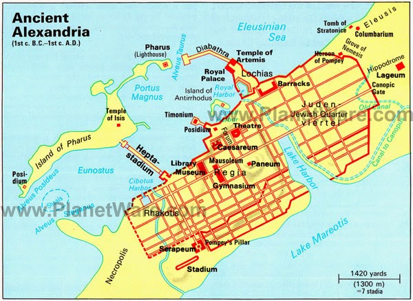 NOTA 6: Parte da cidade antiga de Alexandria foi engolida pelo mar devido a um maremoto. De fato o palácio de Cleópatra e outras construções, se encontram hoje sob as águas do Mediterrâneo.