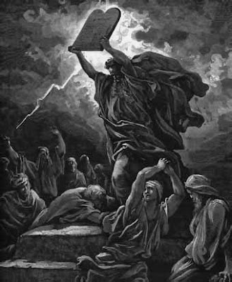 | Gravura em preto e branco, retratando Moisés erguendo as tábuas dos Dez Mandamentos. |