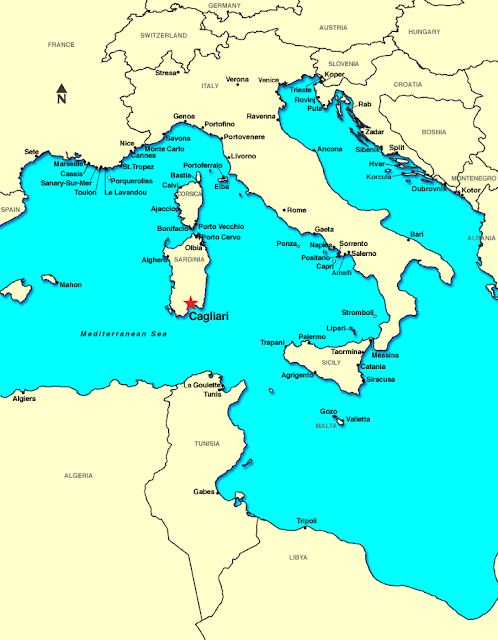 | Localização da cidade de Cagliari, capital da Sardenha, a qual em 1793 foi atacada sem sucesso por Napoleão. |