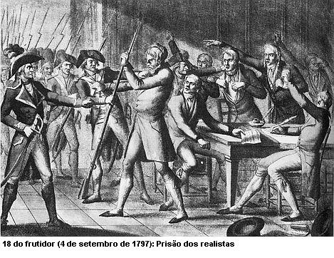 | Gravura representando o golpe de Estado de 18 do Frutidor (4 de setembro) de 1794, onde os deputados moderados, os quais uns eram monarquistas e anti-jacobinos, foram presos. |