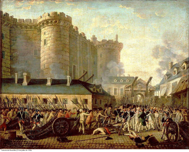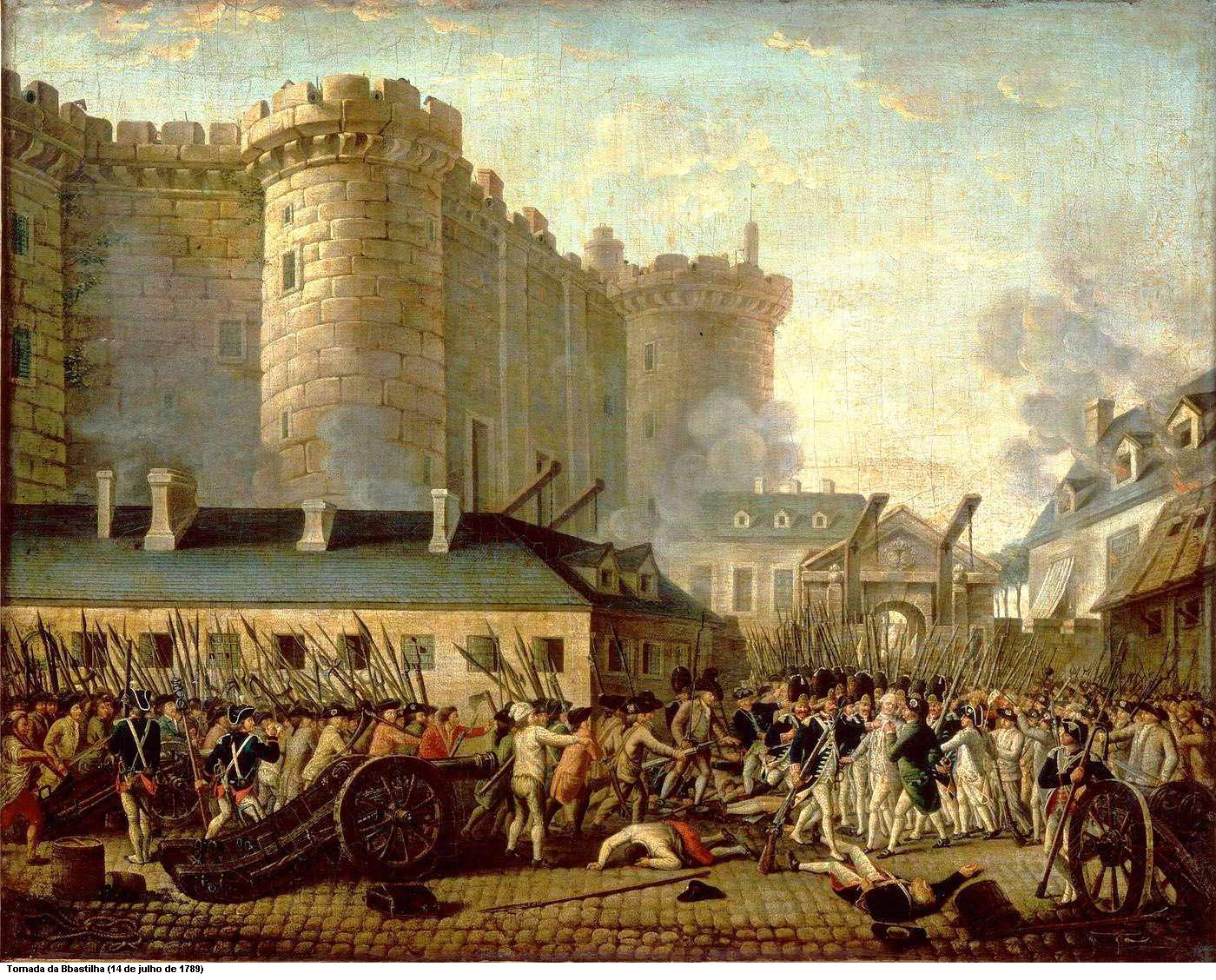 | Pintura retratando o ataque a Bastilha em 14 de julho de 1789. Tal acontecimento tornou-se o marco de início da Revolução Francesa. |