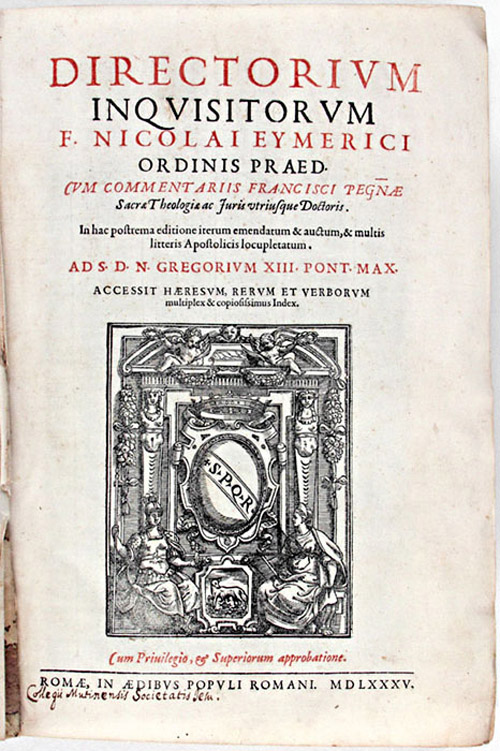| Frontispício de uma edição do Directorium Inquisitorium (Manual dos Inquisidores). |