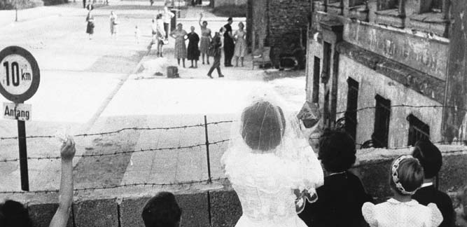 | Fotografia de 1962, mostrando um casal de noivos no lado ocidental, acenando para familiares e amigos no lado oriental, os quais não puderam ir ao casamento. |